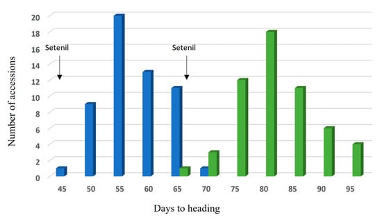 Distribution of spelt wheats by heading date under greenhouse (blue columns) and field (green columns) conditions, respectively.