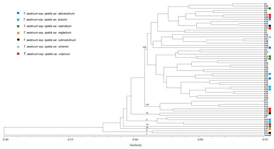 Seven different botanical varieties were included in the spelt collection evaluated in this study (Supplementary Table S1). Among them, two (E51 and E52) were from var. albivelutinum, six (E18, E19, E20, E53, E54, and E55) from var. arduii, four (E21, E22, E23, and E56) from var. caeruleum, one (E57) from var. neglectum, three (E24, E25, and E26) from var. rubrivelutinum, one (E27) from var. schenkii, and six (E28, E29, E30, E58, E59, and E60) from var. vulpinum (Supplementary Table S1). The dendrogram obtained showed that these 23 accessions belonging to the seven spelt botanical varieties did not cluster separately; rather, these accessions were scattered across all spelt Groups in the dendrogram (Figure 3).