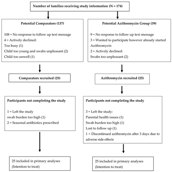 | Demographic | Comparison Group N = 25 (%) | Azithromycin Group N = 25 (%) | p Value for t-Test or Fisher’s Exact Test * |