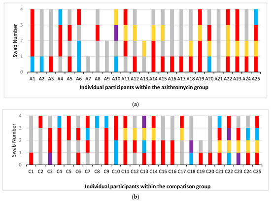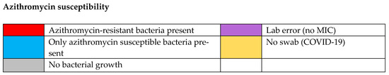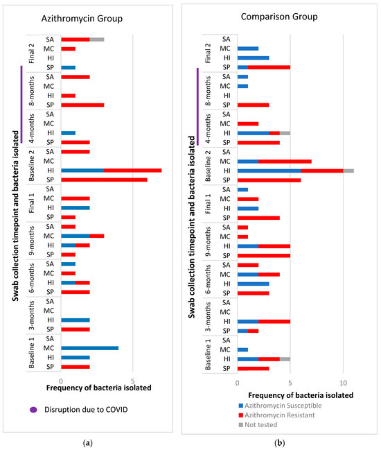 - Malhotra-Kumar, S.; Lammens, C.; Coenen, S.; Van Herck, K.; Goossens, H. Effect of azithromycin and clarithromycin therapy on pharyngeal carriage of macrolide-resistant streptococci in healthy volunteers: A randomised, double-blind, placebo-controlled study. Lancet 2007, 369, 482–490. [Google Scholar] [CrossRef]