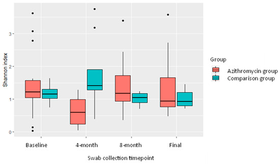 | Swab Round | Number in AZM * Group Actively Taking AZM | Mean Shannon Index AZM Group | Mean Shannon Index Comparison Group | t-Test p Value |