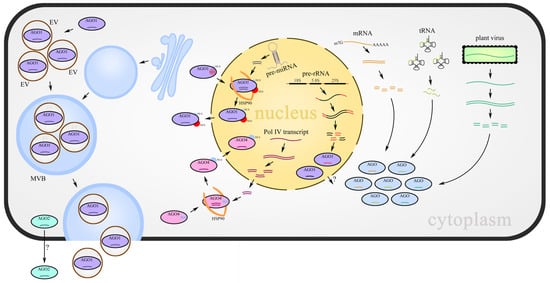 sRNA-AGOs loading provides a balance between distinct classes of sRNAs and participates in small RNA movement. miRNAs produced from MIR genes, risiRNAs derived from aberrant pre-rRNAs, siRNAs derived from abnormal mRNA fragments, tRNA-derived RNA fragments (either from plants or their interacting organisms), and virus-derived sRNAs are loaded into their partner AGOs, respectively or competitively. Cell-to-cell movement of sRNAs is mediated by the AGO2–sRNA complex directly or packaged into EVs with the assistance of AGO1. Loading of miRNAs and 24 nt Pol IV siRNAs cause the configuration change in AGO proteins to expose NES or NLS, which results in sRNAs shuttling between the nucleus and cytoplasm.
