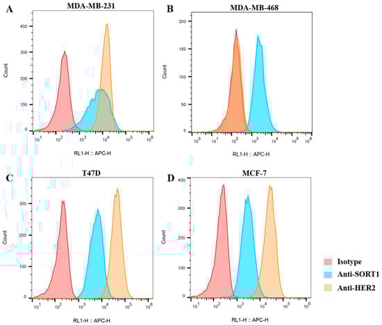 Flow cytometry evaluation of SORT1 and HER2 expression on breast tumor cells. MDA-MB-231 (A), MDA-MB-468 (B), T47D (C) and MCF-7 (D).