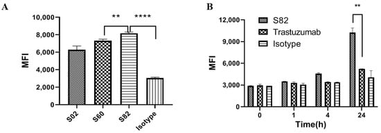 Internalization function of SORT1 antibodies and trastuzumab: (A) Internalization activity of S02, S60 and S82. T47D cells were treated with pHrodoTM green-labeled antibodies (10 nM) for 24 h. Data are presented as mean ± SD from 3 independent experiments. (B) Internalization activity of trastuzumab and S82. Data are presented as mean ± SD from 2 independent experiments. **, p < 0.001; ****, p < 0.0001.