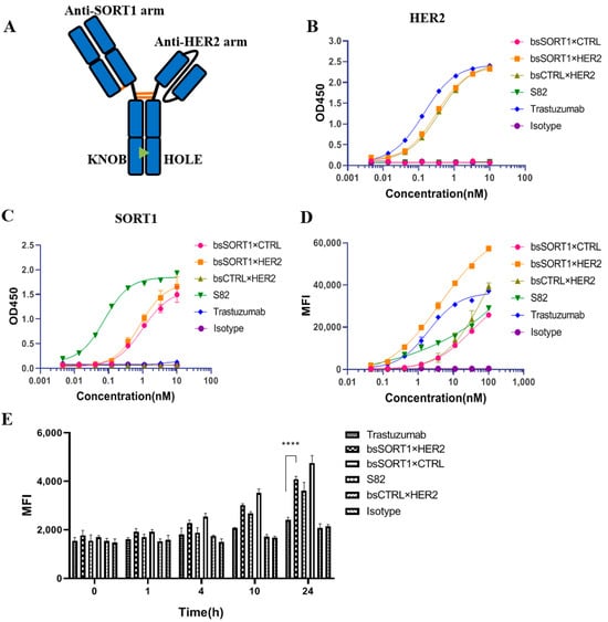 The sequences of SORT1 antibodies S02, S60 and S82 were acquired from patent US10428150B2. The heavy-chain and light-chain sequences of the HER2 antibodies trastuzumab and pertuzumab were acquired from international ImMunoGeneTics information system (IMGT). A nonbinding isotype antibody (CTRL) was used as the negative control in the study. Monovalent BsAb (bsSORT1×HER2) was constructed using the “knobs-into-holes” (KIH) approach [43]. The anti-SORT1 arm derived from S82 is in the form of a Fab format connecting FC domain in knobs, and the anti-HER2 arm from trastuzumab is in the form of an scFv format connecting FC domain in holes (Figure 3A). Using the same method, the corresponding control antibodies bsSORT1×CTRL and bsCTRL×HER2 were constructed, in which the anti-HER2 arm and anti-SORT1 arm were replaced by isotype controls, respectively. All antibody constructs were cloned into the mammalian expression vector pCDNA3.1 (Thermo Fisher, Waltham, MA, USA) for transient transfection and antibody expression in Expi293F (Thermo Fisher, USA).