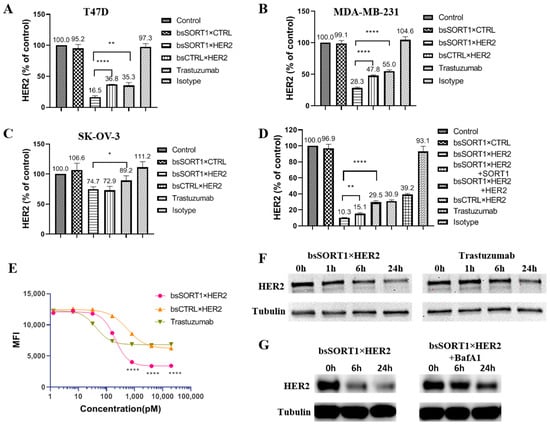 HER2 degradation by SORT1×HER2 bispecific antibody: (A–C) Degradation effects of antibodies on surface HER2 of T47D (A), MDA-MB-231 (B) and SK-OV-3 (C) were detected via flow cytometry. Data were mean ± SD from 3 independent experiments. (D) Degradation of surface HER2 was blocked by HER2 ECD protein and SORT1 ECD protein. Data are presented as mean ± SD from 3 independent experiments. (E) The degradation was evaluated by treating T47D with serially diluted antibodies (from 9.14 pM to 20 nM). IC50 was calculated using GraphPad Prism software 8. Data are presented as mean ± SD from 3 independent experiments. (F,G) HER2 degradation by antibodies was detected using WB. (F) Comparison of the degradation rate of HER2 by bsSORT1×HER2 and trastuzumab. T47D cells were treated with 10 nM bsSORT1×HER2 or trastuzumab for 1, 6 or 24 h. (G) The HER2 degradation induced by bsSORT1×HER2 was blocked by lysosome inhibitor. T47D cells were incubated with 10 nM bsSORT1×HER2 in the absence or presence of BafA1 (1 mM). *, p < 0.05; **, p < 0.001; ****, p < 0.0001.