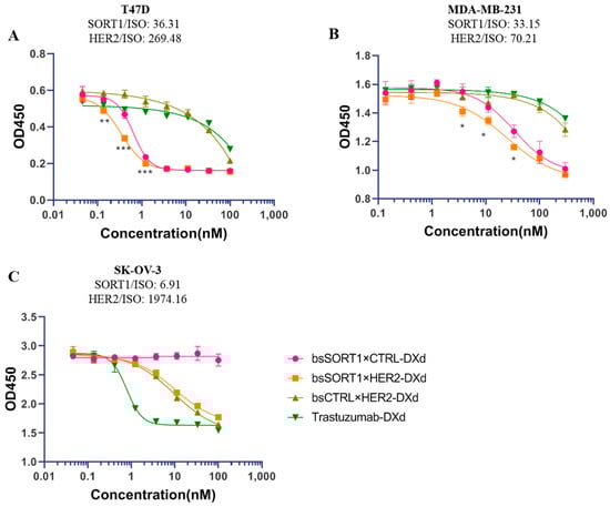 The cytotoxicity activity of ADCs on T47D (A), MDA-MB-231 (B) and SK-OV-3 (C). Cells were treated with serially diluted ADCs for 72 hours and cell viability was detected using CCK8. Data are presented as mean ± SD from 3 independent experiments and IC50 was calculated using GraphPad Prism software. P values were only calculated between bsSORT1×HER2-DXd and bsSORT1×CTRL-DXd using t-test analysis and their significances were shown in the figure. *, p < 0.05; **, p < 0.001; ***, p < 0.0005.