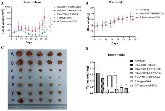 Antitumor efficacy of bsADCs in MDA-MB-231 xenograft model. The tumor-bearing mice were injected intraperitoneally with vehicle (PBS), bsSORT1×HER2, bsSORT1×CTRL-DXd, bsSORT1×HER2-DXd, bsCTRL×HER2-DXd, trastuzumab-DXd and isotype-DXd on day 0 and day 7. Tumor volume (A) and mice weight (B) were measured twice a week. The data are presented as mean ± SD from five mice. After termination, all tumors were taken for photographing (C) and weighing (D). *, p < 0.05; **, p < 0.001.