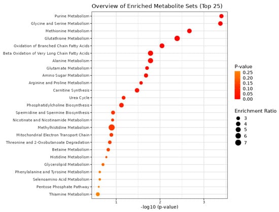 Overview of the metabolic pathways using the MetaboAnalyst bioinformatic tool. Result of the Metabolic Set Enrichment Analysis (MSEA) showing the threefold enrichment of several amino acid and fatty acid pathways.