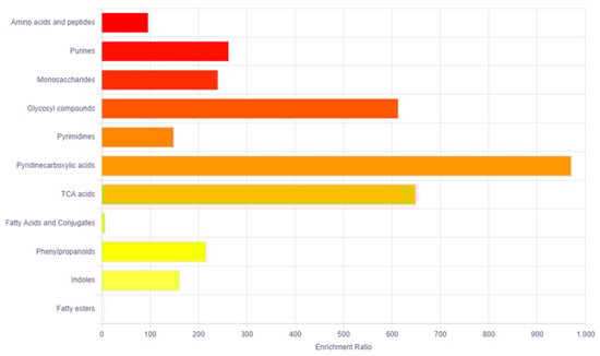 Overview of the main chemical classes using the MetaboAnalyst bioinformatic tool. Result of the Metabolic Set Enrichment Analysis (MSEA) showing the threefold enrichment of amino acids, purines, monosaccharides and glycosyl compounds.