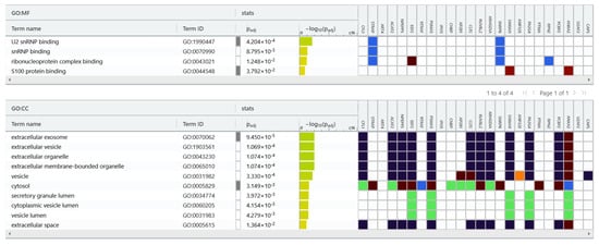 gProfiler classification of the EC proteins identified in the study. Result of proteins set enrichment analysis showing the enrichment of molecular function (MF): U2 snRNP binding, snRNP binding, ribonucleoprotein complex binding, S100 protein binding and cellular component (CC): extracellular exosome, extracellular vesicle, extracellular organelle, extracellular membrane-bounded organelle, vesicle, vesicle lumen, extracellular space, cytosol, and secretory granule lumen.