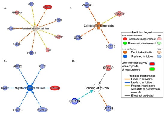 IPA tool showed (Figure 6) that these proteins are set on in top networks corresponding to the following: (A) the apoptosis of tumor cell lines (ANXA2, ARHGDIA, CLTC, PCBP2, PSMA5, PA2G4, PTMA, S100A11 and SNRPB); (B) the cell death of tumor cells (ANXA2, PSMA5, SNRPB and U2AF2); (C) the migration of tumor cell lines (ANXA2, CLTC, PA2G4, RUVBL2, S100A11 and U2AF2); and (D) the splicing of mRNA (SNRPB, STRAP and U2AF2).