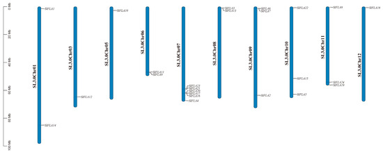 Chromosomal localization of the FLA gene in tomato. Chromosome positioning was based on the physical location of the 24 tomato FLAs. Chromosome numbers are shown at the top of each bar chart. Gene names are indicated in black. The scale bar is on the left.