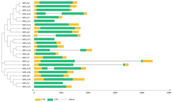 Exon-intron structure of the FLA gene family in tomato. The evolutionary tree was constructed based on the full lengths of tomato FLA protein sequences using MEGA11.0 (v11.0.13). The exon-intron graph of tomato FLA genes was drawn using TBtools software (v1.09876). The untranslated regions (UTRs) are indicated by thick yellow boxes; the exons are indicated by thick green boxes; the introns are indicated by black lines.