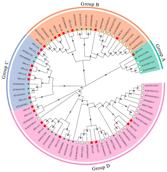 The unrooted phylogenetic tree of the FLA gene family in S. lycopersicum, Arabidopsis, and Capsicum annuum. The maximum likelihood method was used to construct a phylogenetic tree containing 24 tomato, 21 A. thaliana (At), and 30 pepper FLA proteins. The four subgroups are colored differently. The three differently colored shapes represent FLA proteins from three species. The red rectangles are S. lycopersicum, the green stars are Arabidopsis, and the white circles are Capsicum annuum. The number on the node in the phylogenetic tree represents the percentage of trustworthiness of the branch in the bootstrap validation.