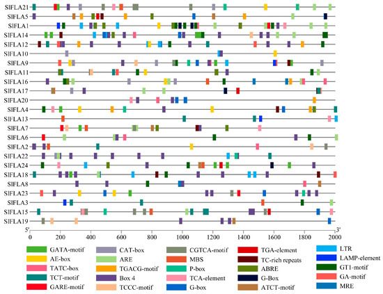 Analysis of cis-acting elements of the FLA gene family in tomato. Different colored wedges represent different cis elements. The length and position of each SlFLA gene were mapped to scale. The scale bar represents the length of the DNA sequence.