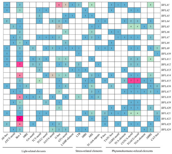 The number of cis-acting elements in tomato FLA genes. The different colors and numbers of the grid indicate the numbers of different cis-acting regulatory elements in these SlFLA genes.