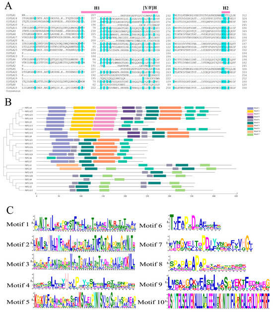 Conserved motif analysis of the FLA gene family in tomato. (A) Conserved structural domains of the tomato FLA gene family. Identical residues are shaded in blue. (B) Sequence analysis of FLA gene family in tomato. The differently colored rectangles are different motifs. (C) Amino acid sequences of different conserved motifs displayed by stacks of letters at each position. The total height of the stack represents the information content of the relative amino acid in the position of each letter in the motif in bits. The height of the individual letter in a stack was calculated by the probability of the letter at that position times the total information content of the stack. The X- and Y-axes represent the width and the bits of each letter, respectively.