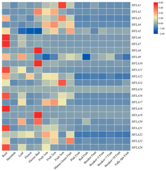 Expression analysis of different tissues of the FLA gene family in tomato. Color scale represents fold change normalized by log2-transformed data. Heatmaps are shown in blue/yellow/red for low/medium/high expression, respectively.