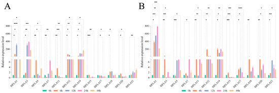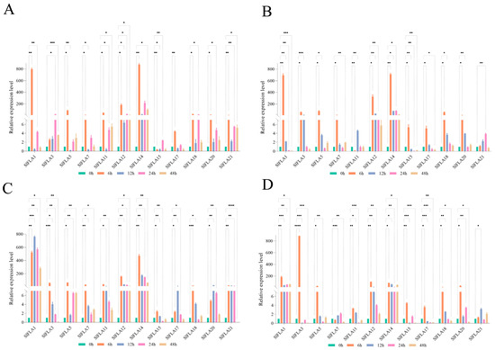 Relative expression analysis of the SlFLA gene under the ABA (A) and MeJA (B) treatments. Error bars represent the standard deviation of the three biological replicates. Different colors indicate different time periods. The asterisk (*) indicates that the expression level of the stress group is significantly different from that of the control group (* p ≤ 0.05, ** p ≤ 0.01, *** p ≤ 0.001, **** p ≤ 0.0001, one-way ANOVA, Tukey’s test).