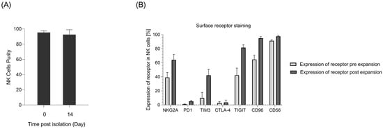 Primary NK cell isolation, expansion, and receptor profile characterization. (A) NK cell purity on the day of isolation and 14 days post-expansion from merged donors measured as CD56+ cells in flow cytometry analyses (n = 6). (B) Flow cytometry analysis of receptor expression in NK cells pre- and post-in vitro expansion (n = 8).