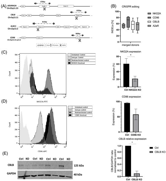 CRISPR-Cas9-based knockout in expanded NK. (A) Schematic illustration showing the cutting sites of Cas9 in A2AR and CD96 genes, as well as NKG2A and CBLB (adapted from previous publication) [24]. (B) Expanded NK cells were transfected with RNP complexes containing sgRNA targeting NKG2A, CD96, CBLB, and A2AR. After Sanger sequencing, indel frequencies were analyzed using the ICE v3 software (www.ice.synthego.com, (accessed on July 2022 to July 2023)). (C,D) NKG2A and CD96 receptor expression in NK cells after knockout was measured using flow cytometry. (E) Immunoblot of CBLB and GADPH in non-transfected NK cells and transfected cells. (E) Normalized CBLB/GADPH ratio of band densitometry in non-transfected and transfected NK cells. * p < 0.05.