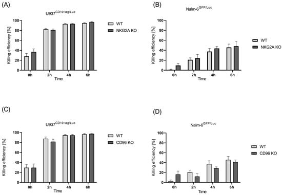The results of the killing assay showed that a modest and statistically insignificant improvement was observed in NKG2A knockout NK cells compared with wild-type cells against the B-ALL and AML cells (Figure 3A,B). Next, the generated CD96 knockout NK cells were incubated with AML and B-ALL cells. Again, CD96 knockout did not improve the killing function of the NK cells. Yet, in some donors, even a reduction in killing was observed against both U937 CD19tag/Luc and Nalm-6 GFP/Luc cells (Figure 3C,D).