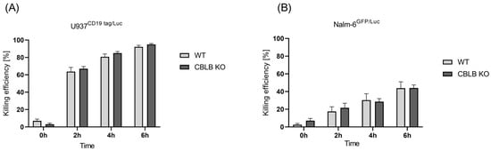 Killing efficiency of unmodified primary NK cells vs. edited CBLB cells. Luciferase assay was performed to check for cytotoxicity of CBLB KO NK cells against (A) U937 CD19 tag/Luc (n = 4) and (B) Nalm-6 GFP/Luc (n = 3) at 0, 2, 4, and 6 h after coculture at a 5:1 E:T ratio. Specific lysis is shown as mean ± SE.