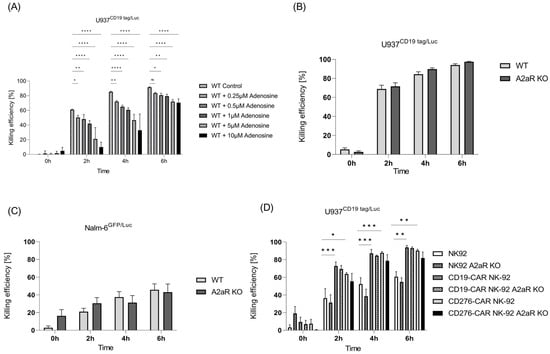 To evaluate the cytolytic capabilities of expanded NK cells in the presence of adenosine, a cytotoxicity luciferase assay was performed. To this end, NK cells were treated with different concentrations of adenosine in the assay medium and subsequently incubated with U937 CD19tag/Luc cells. As shown in Figure 5A, a significant adenosine con-centration-dependent reduction was observed for the killing performance of NK cells against U937 CD19tag/Luc. This effect was mostly discernible at 2 and 4 h post-coculture of the effector and target cells. In contrast, the cytotoxicity of NK cells against the B-ALL cell line (Nalm-6GFP/Luc) was not affected by extracellular adenosine amount, and no improvement was observed in A2AR-depleted NK cells (Figure 5B,C).