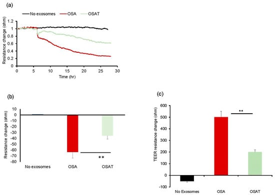 Next, we tested the impact of OSA and OSAT exosomes on human endothelial cell barrier integrity and changes in endothelial barrier impedance using ECIS. Exosomes from OSA patients induced greater disruption of the endothelial monolayer barrier integrity compared with OSAT (Figure 1a,b). The normalized resistance change was higher in OSA (−63 ± −6.81%) compared with OSAT (−35.83 ± −4.84%) (p = 0.001). We also used TEER to confirm the integrity and permeability of the endothelial cell monolayer. We found that the TEER values in trans-wells treated with exosomes derived from OSA were 6.1 ± 0.62 Ω·cm−2 compared with 3.73 ± 0.42 Ω·cm−2 for OSAT (p = 0.001). The TEER-normalized values were 500.67 ± 48.25 for OSA and 200.82 ± 20.48 for OSAT (p-value 0.003) (Figure 1c).
