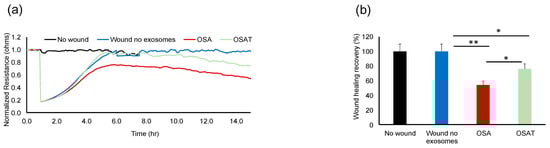 The functional relevance of exosome transfer between HMVEC-d cells were investigated using ECIS in a wound-healing assay (Figure 2a). ECIS has also been used as an electric wound-healing assay to monitor cell migration [40]. Indeed, exosomes derived from OSA applied to HMVEC-d cells exhibited significantly slower recovery (54.23% ± 6.12%) when compared with OSAT (76.28% ± 8.21%; p = 0.001), as shown in Figure 2a,b, respectively. A quick drop in barrier resistance is observed when the dead cells detach from the electrode surface. Following this, cells migrate into the wounded area, and the impedance gradually increases and reflects the healing process. This automated assay has the advantage that the wound area is well defined and highly reproducible.
