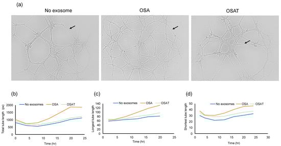 Plasma exosomes altered human endothelial cell tube formation (angiogenesis) in vitro. Plasma-derived exosomes from OSA or OSAT were applied on a 3-D matrix endothelial cell culture system to assess angiogenesis, and tube lengths were quantified using ImageJ software 2.9.0. The formation of tube-like structures was observed under bright field. (a) Representative of phase contrast micrographs of the capillary-like tubular structures of OSA and OSAT and compared with no exosomes for 24 h. Arrow indicates tube formation. (b) Line graphs showing total tube length, (c) longest tube length, and (d) shortest tube length. Tube formation was quantified by counting the number of branching points in the total photographed area. n = 12. Scale bar 100 μm.
