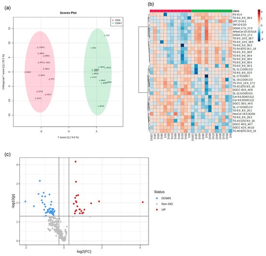 Lipidomic analysis of OSA exosomes using LC-MS/MS. (a) Supervised OPLS-DA model showing separation of OSA and OSAT groups. (b) Heatmap showing the top differentially expressed lipids. (c) Volcano plot depicting the total differentially expressed lipids. The red color indicates up-regulation, and the blue color indicates down-regulation. n = 12/group.
