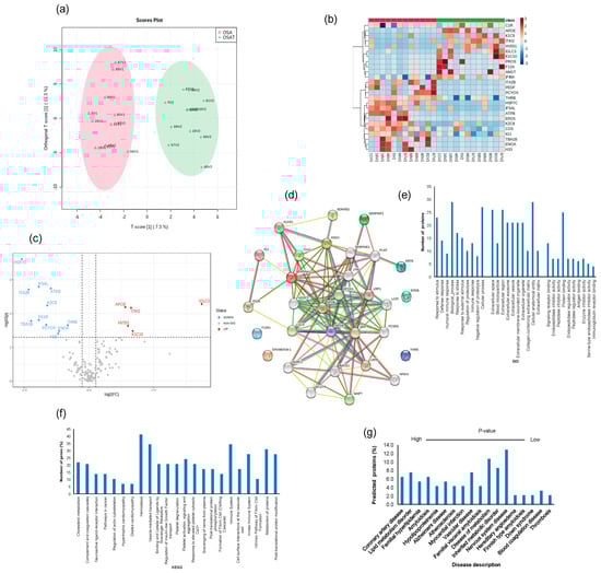 Proteomic analysis of OSA and OSAT using in situ digestion on LC-MS. (a) Orthogonal partial least square discriminant analysis (OPLS-DA) for the separation of two groups, (b) heatmap analysis, (c) volcano plots and (d) protein–protein network for differentially expressed proteins. The red color indicates up-regulation, and the blue color indicates down-regulation. n = 12/group. Temporal changes of gene ontology and KEGG pathways for exosome proteomics analysis for OSA and OSAT subjects. The differentially expressed proteins (DEPs) were subjected to KEGG, GO, and disease description. (e) Top terms from GO functional enrichment analyses based on DEPs of biological processes (BP), cellular components (CC) and molecular functions. (f) Top KEGG pathways based on pathway enrichment analysis KEGG) of DEPs pathways, and (g) disease description. All proteins associated with disease tissue networks were identified according to the DISEASES database.