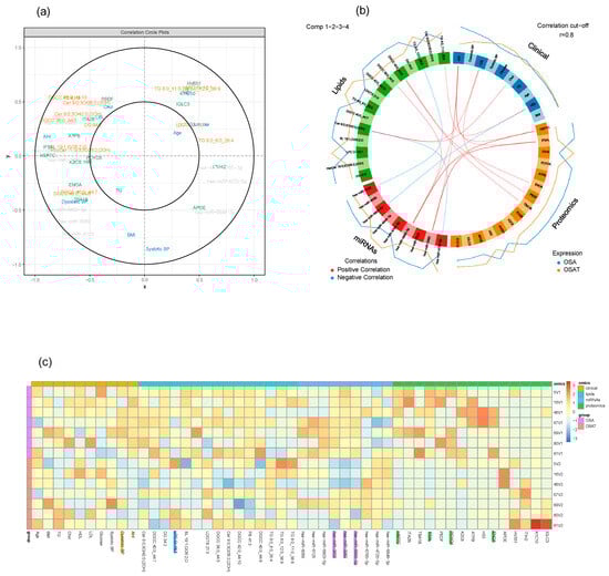 Graphical representation of a multi-block analysis performed on OSA and OSAT. (a) Variable plot highlighting the contributions for OSA clinical data, exosome cargo including lipids, proteins, and miRNAs. Markers in the outer circle are more significant and contribute more to separating the two conditions. Those in the inner circle are less significant than ones in outer circle. (b) Circos plot depicting the strongest correlation biomarkers in the multi-omic biomarker panel in OSA and OSAT. Circos plot of clinical, lipids, proteins, and miRNAs showing Spearman’s correlation analysis (p < 0.05) between OSA and OSAT multi-omics, classified based on the superclass. (c) Heatmap clustering of the variables (clinical data, lipids, proteins, and miRNAs) to represent the muti-omic profiles for the 7 samples. Red indicates a positive correlation, and blue indicates a negative correlation. The variables were selected by applying DIABLO to cellular frequency, gene, and metabolite module datasets depicted using a Circos plot. The variables indicated in the ideogram are connected with either red or blue to other variables if the correlation is either positive or negative. Only correlation above a certain threshold is depicted (r = 0.8). The lines around the ideogram are drawn by connecting the average expression value of a given variable for a certain phenotypic group.
