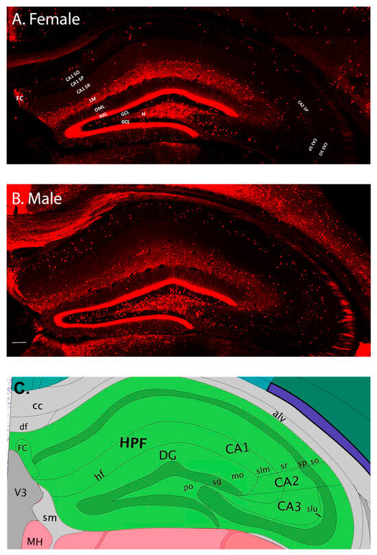 Qualitative analysis of hippocampal D2 receptor-expressing neurons in male and female mice. Representative confocal z-stack micrographs of a 10-week-old female sham (A) and male sham (B) hippocampus illustrate baseline D2 expression. Qualitative evaluation revealed differences in D2 expression patterns in females compared to age-matched males. These differences include a generally lower D2 expression in females compared to males, most visibly in the C3 and CA2 boutons, the granule cell layer (GCL), and the hilus. In the outer plexiform molecular layer of the suprapyramidal blade in male mice, D2-expressing cells are preferentially observed close to the border with stratum lacunosum moleculare (LM). However, in the female mice, the D2-expressing cells in this region exhibit a more heterogeneous expression. Additionally, patches of intense D2-expressing apical dendrites in the molecular layer (ML) of the dentate gyrus were observed in male mice that were less prominent in female mice. This may indicate a difference in the types of cells (e.g., D2-expressing vs. non-D2-expressing) being innervated by the perforant pathway. In the male mice, the CA3 and CA2 regions contain numerous small puncta-like stainings that likely represent D2-labeled mossy fiber boutons. These boutons are only sparsely observed in female mice. Female mice also exhibit lower D2 expression in the fasciola cinereum (FC). In this region, large D2-expressing cells and proximal portions of their processes were observed in both male and female mice, with the male mice appearing to have greater expression. In (C), a representative atlas image (Allen Mouse Brain Atlas, mouse.brain-map.org and atlas.brain-map.org) depicts hippocampal subregions (in green) in the mouse. Scale bar in (B) = 75 µm for both images.