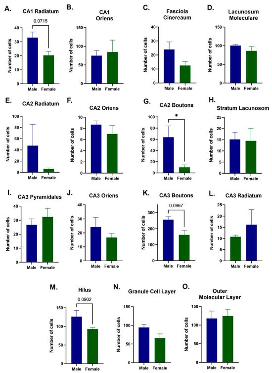 Sex differences in hippocampus D2 expression. Quantification of D2-expressing neurons by region of the hippocampus revealed modest baseline sex-related expression differences. In general, female mice trended towards less D2 expression compared to males. Female mice had lower D2 expression in the stratum radiatum of the CA1 (p = 0.0715, NS) (A). Female mice also had lower expression in both the CA2 (p < 0.05) (G) and CA3 boutons (p = 0.0967, NS) (K). This can also be seen in the hilus of the dentate gyrus (p = 0.0902, NS) (M), the granule cell layer (p = 0.1729, NS) (N), and in the fasciola cinereum (p = 0.1238, NS) (C). On the other hand, no significant changes or trends were observed in CA1 stratum oriens (B), lacunosum moleculare (D), CA2 stratum radiatum (E), CA2 stratum oriens (F), stratum lacunosum (H), CA3 stratum pyramidales (I), CA3 stratum oriens (J), CA3 stratum radiatum (L), and the outer molecular layer (O). Data expressed as mean ± SEM, n = 2 for males, n = 3 for females; * p < 0.05.