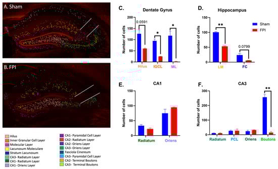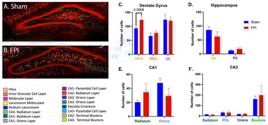 Previous studies examining TBI in female mice have shown that they are generally more resistant to injury-induced neurodegeneration [58,59,60]. Consistent with this notion, the female FPI mice did not have any significant effects on the D2-expressing neurons in either the ipsilateral or contralateral hemispheres (Figure 4A–F), compared to female sham mice. In the dentate gyrus, no significant effects of FPI on the D2-expressing neurons were observed, although a trend (p = 0.091, NS) towards an increase was observed in the ipsilateral hilus (Figure 4C).
