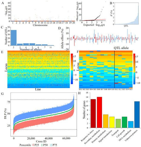 Identification of DLP QTL-allele system using RTM-GWAS. (A): Manhattan (left) and quantile-quantile plot (right). The vertical axis indicates the −log10p value, and the horizontal axis represents chromosomes, with the solid red line indicating the genome-wide threshold of p = 0.05. Blue and orange are used to distinguish the QTLs of adjacent chromosomes. (B): Phenotypic contribution of the detected 66 DLP QTLs. (C): Distribution of number of alleles on the 66 DLP QTLs. (D): DLP allele effects of the 66 main-effect QTLs. Red and blue are used to distinguish the effect of adjacent QTL alleles. (E): DLP QTL-allele matrix. The horizontal axis represents variety in CSLRP, while the vertical axis denotes the detected QTLs on chromosomes. The allele effects are expressed in colors, where the red color indicates a positive value and blue color indicates a negative value, with dark color indicating effect sizes. (F): The QTL-allele matrix of 66 main-effect QTLs in the selected 10 highly resistant and 5 highly susceptible accessions. (G): The distribution of predicted progeny DLP of possible crosses in CSLRP. The horizontal axis represents the possible crosses arranged in an increasing order of the predicted 50th percentile DLP, while the vertical axis indicates the predicted DLP with P25, P50 and P75 or the 25th, 50th and 75th percentile of each cross expressed in different colors. The dotted lines indicate the maximum and minimum of the observed accessions in CSLRP. (H): GO biological process distribution of candidate genes annotated from the 86 antixenosis QTLs against CCW in CSLRP.