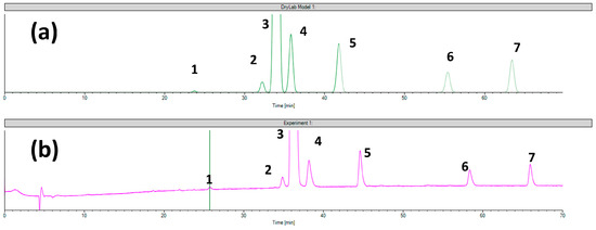 The comparison of (a) virtual chromatogram generated by the DryLab and (b) the experimental chromatogram obtained in case of setpoint 1 tested for Chiralcel OD column (1—ezetimibe diol; 2—desfluoro ezetimibe; 3—ezetimibe API; 4—THP compound; 5—ezetimibe ketone; 6—TBDMS ketone and 7—benzylated ezetimibe).