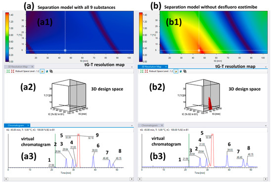 The obtained three-dimensional separation models are represented in Figure 3a,b. As in the case of the Chiralcel OD column, no setpoints were found for the baseline separation of all nine peaks (Figure 3(a1,a2)). Thus, further refinement was carried out by excluding desfluoro ezetimibe because it overlapped with the API in numerous corner runs (Figure 3(b1)). An optimal condition was selected from the first model and the virtual chromatogram was visualized, and it was shown that the desfluoro ezetimibe was co-eluted with the ezetimibe API. The virtual chromatogram for the same conditions was extracted from the second model too, where it can be viewed that the retention times are the same, only the status of the critical peak pairs (marked with red) is changed. This comparison was performed to demonstrate that the exclusion of the peaks has no effect on the retention model, but the second model is more useful for method optimization regarding the identification of MODR and control strategy establishment.