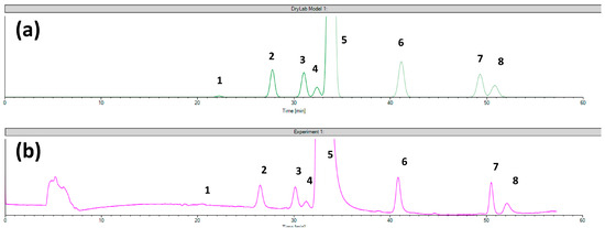 The comparison of (a) the virtual chromatogram generated by the DryLab and (b) the experimental chromatogram obtained in the case of setpoint 1 tested for Chiral CD-Ph column (1—ezetimibe diol; 2—THP compound; 3—RRS ezetimibe; 4—monofluoro ezetimibe; 5—ezetimibe API; 6—ezetimibe ketone; 7—TBDMS ketone; 8—benzylated ezetimibe).