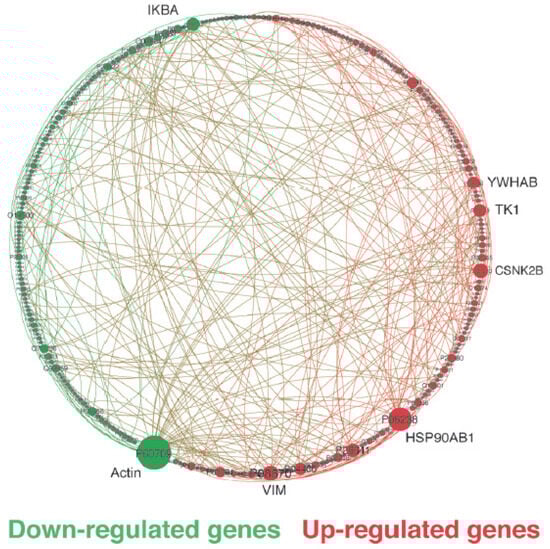 Circular layout of a sub-network consisting of differentially expressed genes between MDA-MB-231 (Triple-Negative) and MCF10A (non-tumoral). The nodes represent genes, while the links represent interactions between genes. We only clearly display the significant differentially regulated hubs with their gene symbols. Other vertices should not be taken into account and are shown according to their UniprotKB accession number. The size of the nodes corresponds to the degree of connectivity, and the colors (green for down-regulated and red for up-regulated) indicate the differential expression pattern of genes in tumoral versus non-tumoral breast cell lines. The network was visualized using Gephi (adapted with permission from ref. [8], Copyright is licensed under an open access Creative Commons CC BY 4.0).