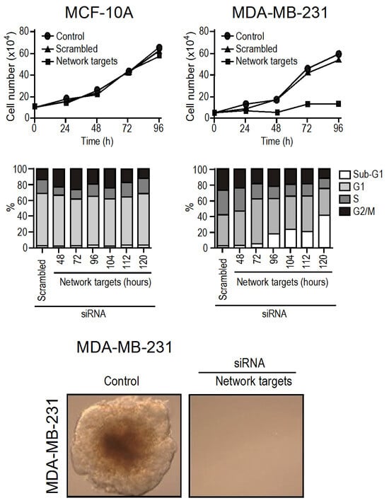 Up to this point, we have achieved successful in vitro validation of hub-based theranostics through small interfering RNA (siRNA) and found it to be conclusive. By selecting the top-five targets that were up-regulated in the triple negative MDA-MB-231 cell line compared to the non-tumoral MCF10A, we observed that MCF10A continued to grow normally while the growth of MDA-MB-231 was stopped, and the metastatic potential of MDA-MB-231 was completely turned off. Cell death was observed to increase from 48 h to 120 h (limit of the experiment) after silencing (Figure 3).