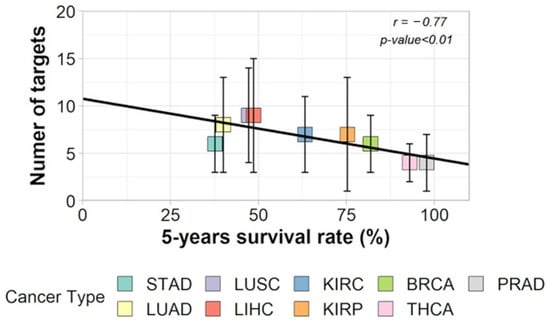 Correlation between number of targets and 5-year OS of each cancer type (Stomach adenocarcinoma: STAD, Lung adenocarcinoma: LUAD, Lung squamous cell carcinoma: LUSC, Liver hepatocellular carcinoma: LIHC, Kidney renal clear cell carcinoma: KIRC, Kidney renal papillary cell carcinoma: KIRP, Breast invasive carcinoma: BRCA, Thyroid cancer: THCA, Prostate cancer: PRAD) (adapted with permission from ref. [17], Copyright is licensed under an open access Creative Commons CC BY 4.0).