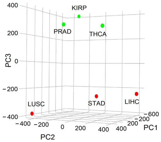 Principal component analysis (PCA) representation of the variance associated with cancer aggressiveness considering the WNT and cross-linked pathways showing a clear division of cancer types into H (red: STAD: stomach adenocarcinoma, LUSC: lung squamous cell carcinoma, LIHC: liver hepatocellular carcinoma) and L (green: KIRP: kidney renal papillary cell carcinoma, THCA: thyroid cancer, and PRAD: prostate cancer) classes according to PC3 (adapted with permission from ref. [23], Copyright is licensed under an open access Creative Commons CC BY 4.0).
