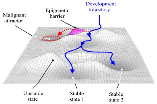 Modeling the basins of attraction can aid in comprehending the molecular behavior of tumors [27]. In this regard, each gene expression profile corresponds to a cell state in a multidimensional space where stable states define cell phenotypes and are characterized as equilibrium points in the phase space. The stochastic nature of gene regulation causes other states to result in the same attractor phenotype and, thereby, to contribute to its basin of attraction [28,29]. These features are analogous to the Waddington epigenetic field, where the valleys depict the basins of attraction of the attractors and the hills represent epigenetic barriers and unstable states (Figure 6).