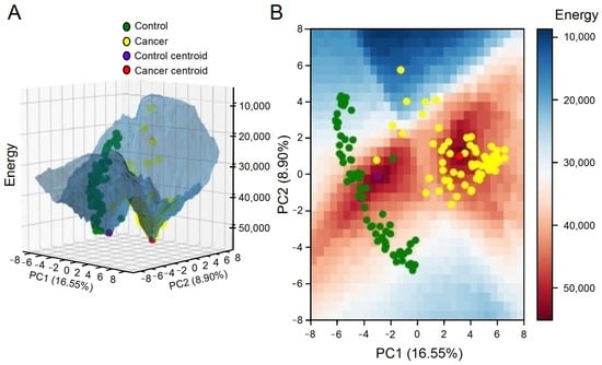 A three-dimensional (A) and a two-dimensional grid (B) were used to plot an energy landscape depicting both control and tumor attractors, as well as samples (adapted with permission from ref. [27], Copyright is licensed under an open access Creative Commons CC BY 4.0).