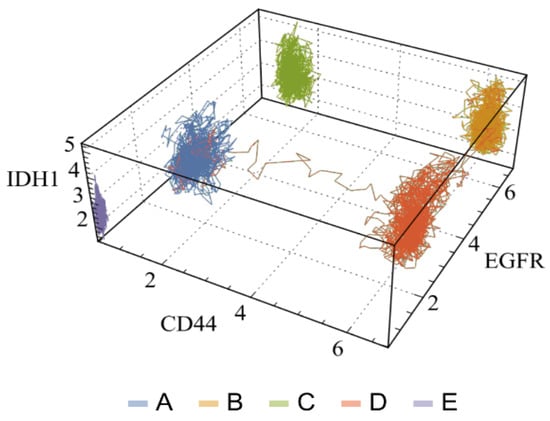 Three-dimensional visualization of full trajectories in a three-subtype marker space of glioblastoma multiforme. Each axis shows the expression values of a specific marker gene, while each line corresponds to the complete time of the three trajectories analyzed. Each color or letter denotes the corresponding basin (adapted with permission from ref. [34], Copyright is licensed under an open access Creative Commons CC-BY-NC-ND 4.0).