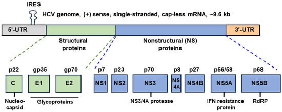 Hepatitis is most commonly caused by the namesake hepatitis viruses A, B, C, D, and E, and constitutes a major public health burden [1,2]. Though they all infect hepatic cells and affect liver function, the hepatitis viruses are diverse both genetically and clinically. Hepatitis C virus (HCV) is the only member of this group that belongs to the Flaviviridae family and contains a positive-sense (i.e., mRNA sense), single-stranded RNA genome of ~9.6 kb (kilobase) [3,4]. The genome is readily translated by the host cell’s translation machinery by a relatively unique initiation mechanism that is independent of the 5′-cap but utilizes an internal ribosome entry site (IRES) consisting of alternate RNA hairpin structures that are regulated by a specific microRNA, miR-122, prevalent in the liver cells. Translation of the long open-reading frame produces a single, large polyprotein, ~3000 amino acids long [5]. The polyprotein is rapidly cleaved by host and viral proteinases to generate at least 10 individual proteins [6,7,8]. The only structural proteins that comprise the enveloped virion architecture are: the nucleocapsid (also called the core, or C protein; p22) and the two envelope glycoproteins, E1 and E2. All other viral proteins are nonstructural: nonstructural 1, 2, 3, 4A, 4B, 5A, and 5B (NS1 through NS5B) (Figure 1).